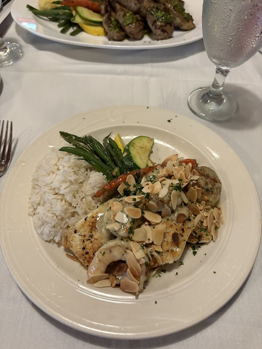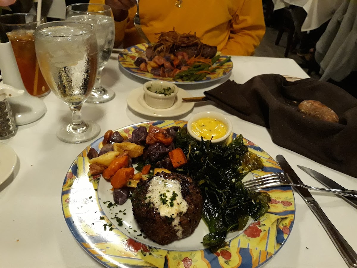 The service was excellent, friendly and attentive. My boyfriend ordered the steak topped with onions, which was delicious and perfectly seasoned. I had a Louisiana, creole style fish dish that was rich and full of flavor. The first few bites were great, but the intensity of the seasoning got to be a bit much for me. The presentation, however, was absolutely beautiful. The ambience was a little off from what I anticipated; I was expecting a dimly lit, more romantic dining space, but it was brighter and livelier than I imagined. Very loud at peak dinner time. Overall, a lovely dining experience with great service and beautifully prepared dishes.