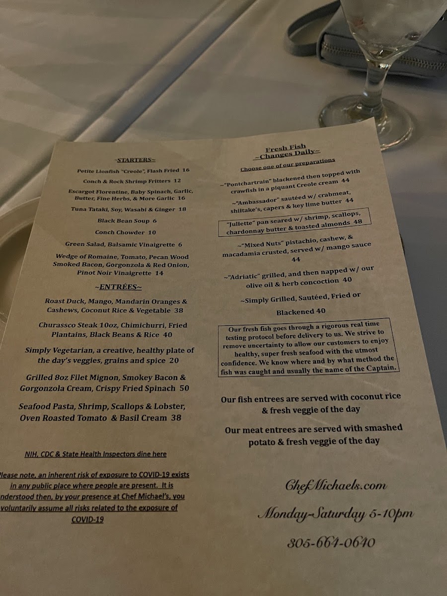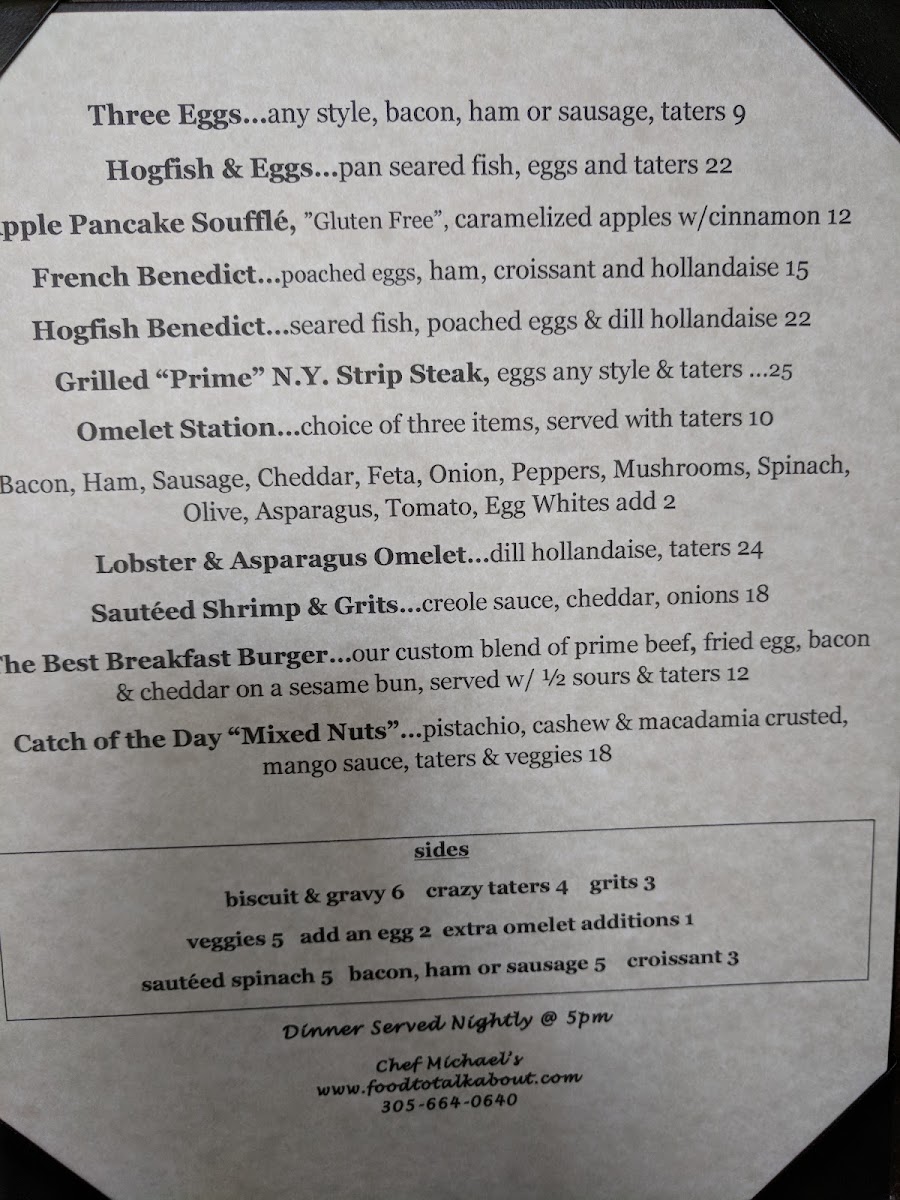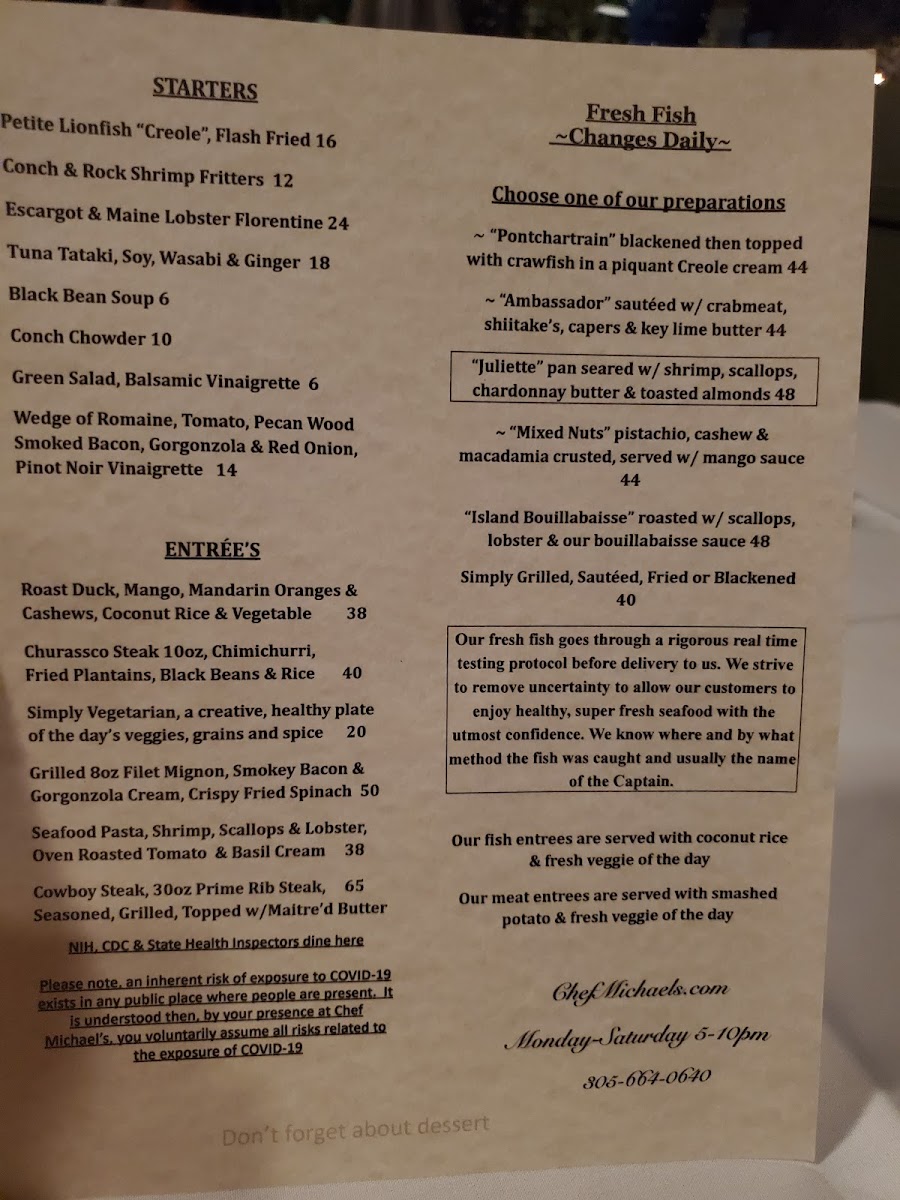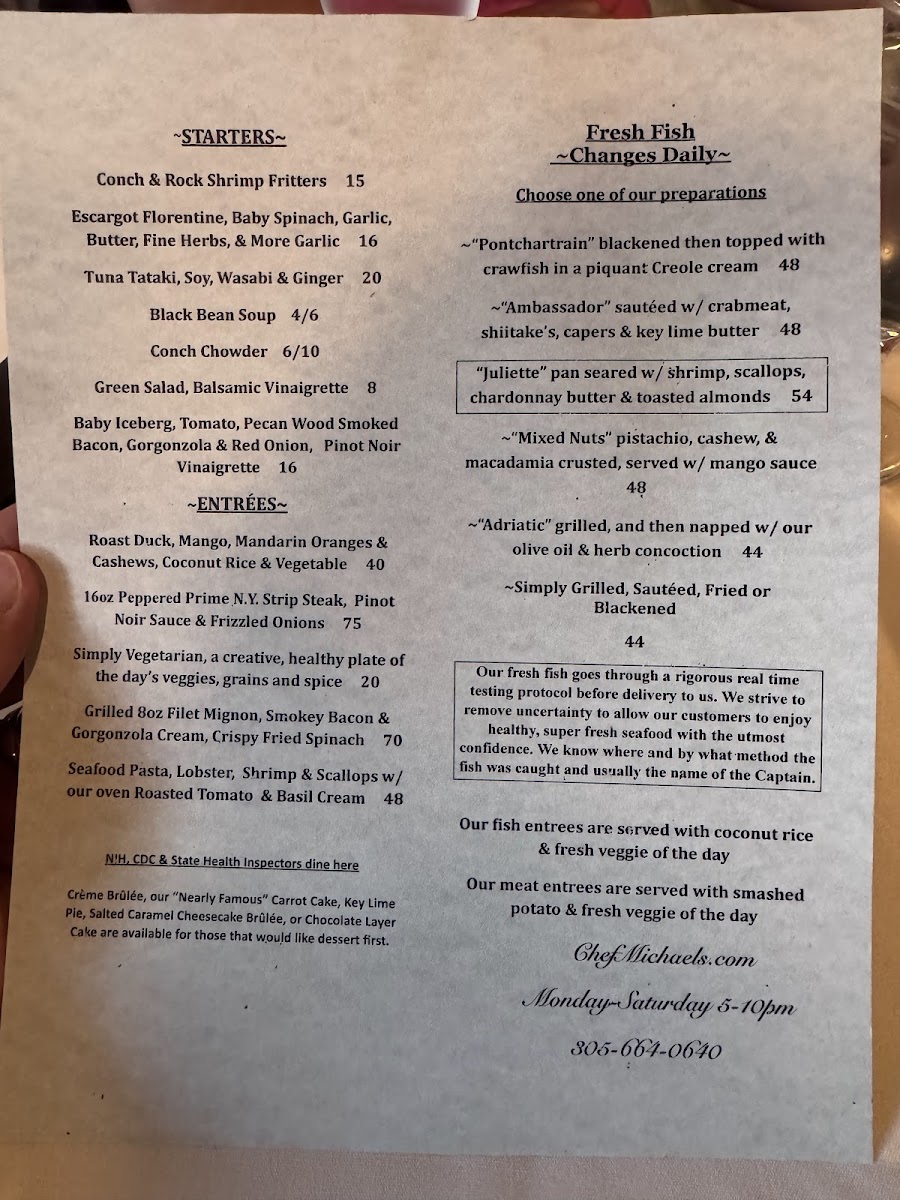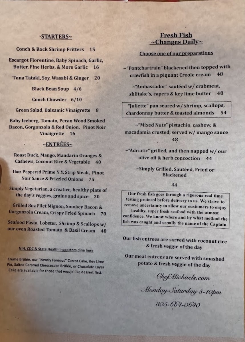 Chef Michael’s menu offers a carefully curated selection that reflects the coastal charm and relaxed elegance of Islamorada. The style leans toward refined, fresh seafood and classic American fare with a touch of Creole influence, making it a comfortable choice for both casual dinners and special occasions.